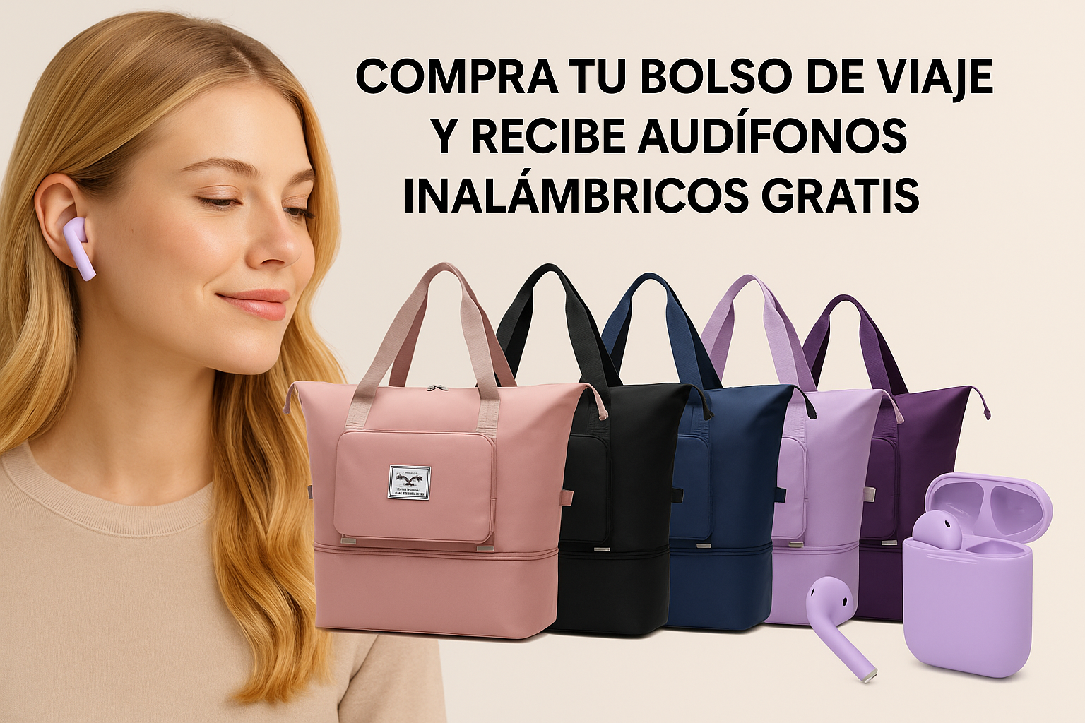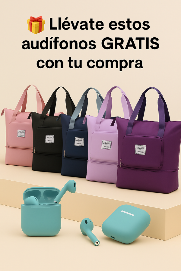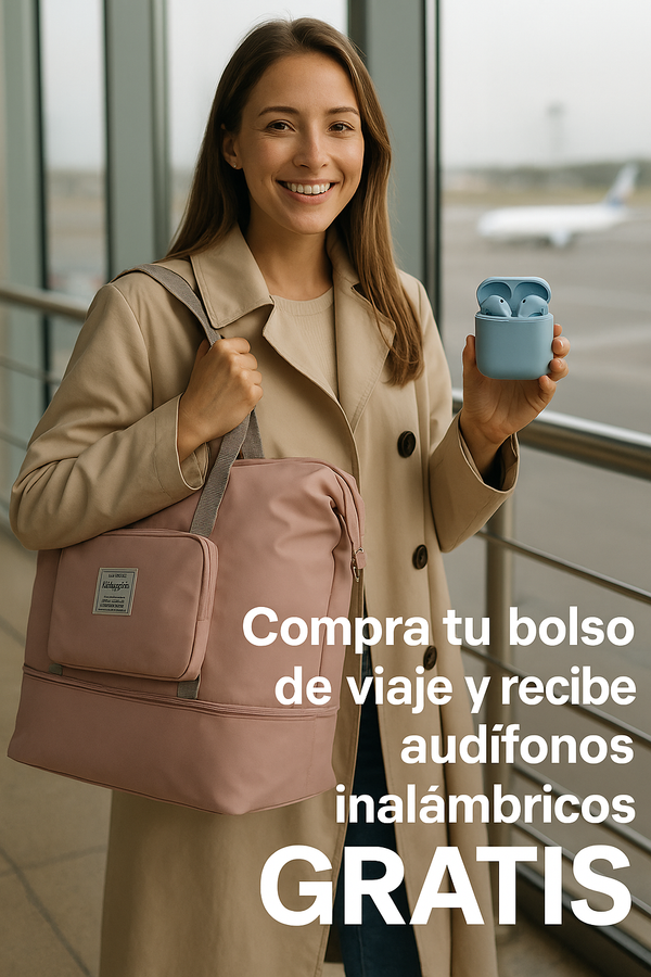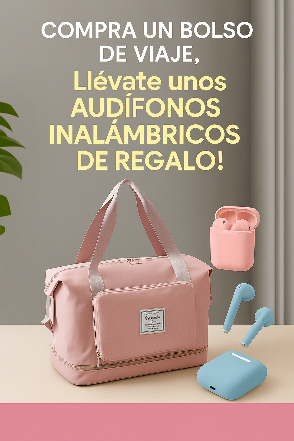 Descubre el bolso de viaje multifuncional que hará tu día más fácil. Espacioso, moderno y resistente, es perfecto para el gimnasio, tus escapadas de fin de semana o el uso diario. Y lo mejor: con tu compra te llevas unos audífonos inalámbricos de regalo, para que viajes ligero, organizado y siempre conectado.