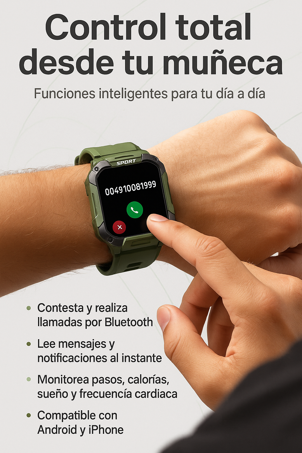Sí. El smartwatch permite contestar y realizar llamadas por Bluetooth, además de ver notificaciones y mensajes sin sacar el celular.